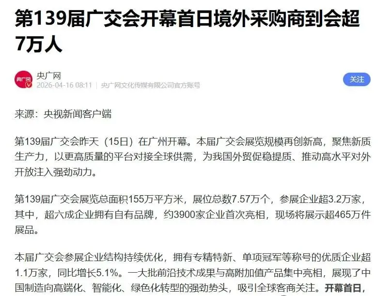 139届广交会在昨天上午正式开展,广交会作为中国外贸的晴雨表,本届广交会采购商报名人数超21万,本次广交会首日境外采购商超7万人。