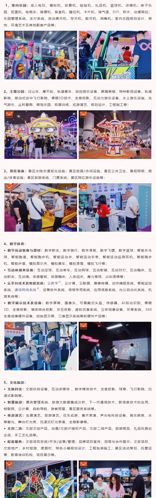 展会规划15万平方米展览面积,汇聚1500家参展企业,预计吸引15万专业观众。同期联动景区装备、数字体育、泳池SPA、AR/VR、旅居民宿、游艇房车等专题展,并举办数十场文旅产业论坛,覆盖室内乐园、主题公园及文旅科技全产业链。