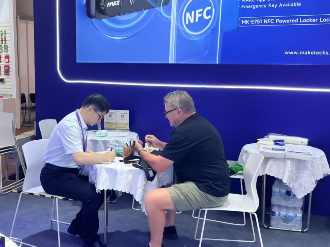 厦门美科安防科技专注于精密金属及塑胶结构件制造领域,产品涵盖智能电子锁、寄存柜锁、机车锁及服务器构配件等,本届展会推出新品NFC电子锁,配套自研APP,安全与便捷兼得,开展首日已接待30多组客商。
