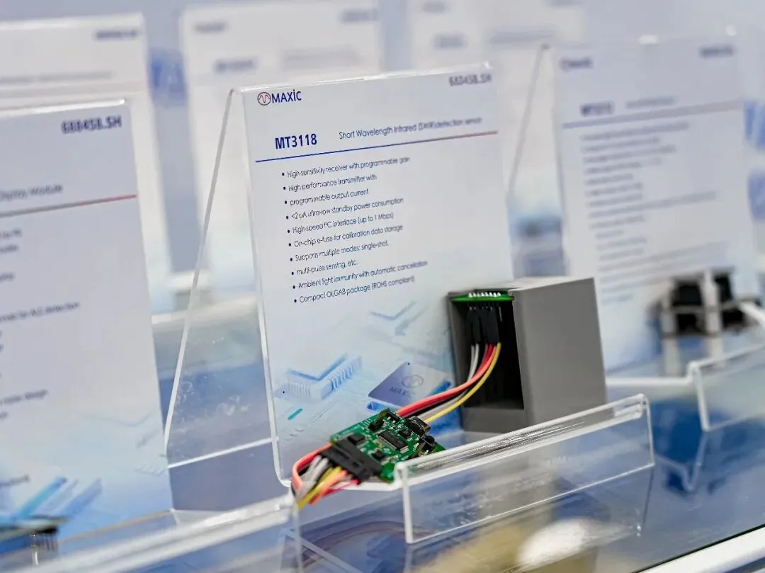 2026年4月14日,全球传感器领域的标杆盛会——深圳国际传感器与应用技术展览会(Sensor Shenzhen 2026)在深圳福田会展中心盛大启幕,为期3天的展会深度聚焦技术创新、应用拓展,打造了“展览+论坛+对接” 的产业生态服务平台。美芯晟受邀出席此次展会,首次在传感器产品阵列中加入磁传感技术,与光学传感、ToF传感等共同呈现,构建起“环境感知+多模态融合感知+运动感知”的完整解决方案,为智能感知领域赋能。在光学传感器领域,我们重点展示了DTOF光学测距、环境光检测、接近检测、光学追踪传感、屏下RGB+Flicker检测等多款智能感知芯片。此外,最新产品皮肤活体检测光学传感器MT3118也首次亮相展会。该芯片集成双波长红外光学系统,通过水分吸收差异区分皮肤与其他物体,可实现高可靠的佩戴检测。在磁传感器领域,我们带来了通用磁传感器、马达驱动芯片、齿轮传感器、智能座舱传感器、电感式接近开关、漏电保护芯片等多款产品,可广泛应用于新能源汽车、工业自动化、消费电子、智能家电、机器人等领域。重点展出汽车智能座舱传感器GH2101/2202系列,满足AEC-Q100标准,可应用于汽车座椅、车窗/天窗、侧滑门/电动尾门等电机的方向和位置检测。
