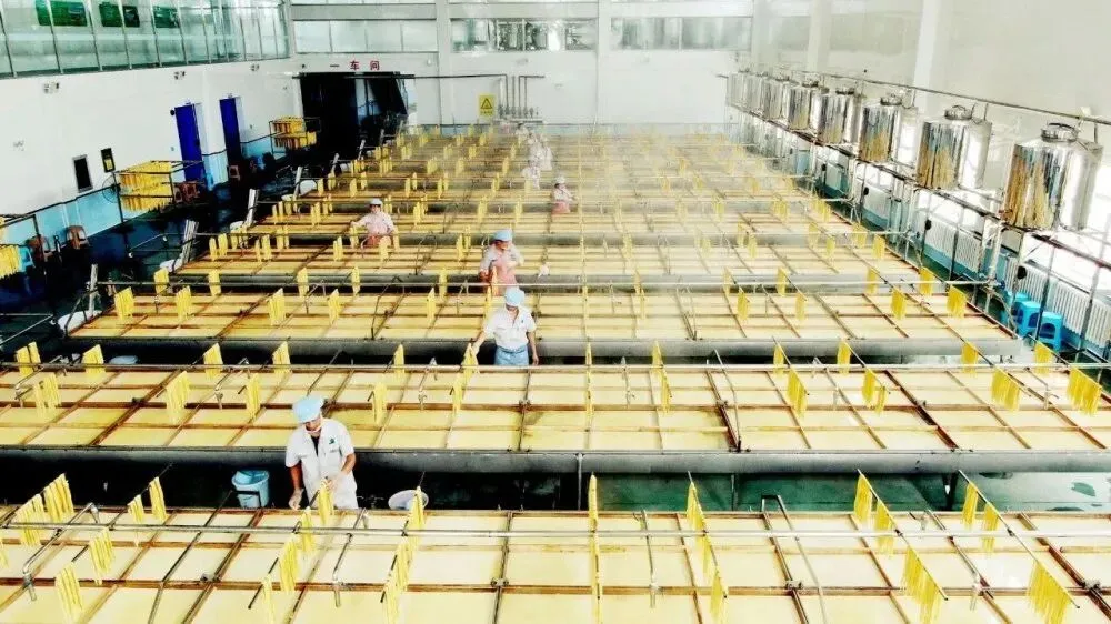九三大豆作为主打品牌,大豆产品的种类也是非常的丰富,像大豆油、腐竹、即食豆干等产品,那么在现场还设置了品鉴区域,供客商们能够现场的品尝,来更加直观的了解九三的优特产品。我手里的这一款北大荒腐竹来自于荣军农场有限公司,究竟它是怎样生产出来的呢?我们现在来连线在生产现场的我的同事,王艳你好。