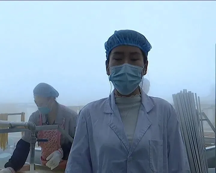 你好,真贞,我现在是在九三分公司荣军农场有限公司的腐竹的生产加工车间,大家可以看到,每条生产线上都配有一名员工进行生产,我们的腐竹是采用民间的传统手工工艺,选用优质的九三大豆,通过浸豆磨浆、滤浆上锅、煮浆挑膜、烘干成竹,这样在生产过程中,是零添加的,对腐竹营养成分能够充分保留,满足消费者对食品的营养健康要求。在我们加工车间共有40条生产线,每天可加工腐竹大概有6500斤左右,目前我们的产品大部门销售到北京、天津、上海等地。下一步,我们还将继续增加腐竹的种类,满足市场的需求。