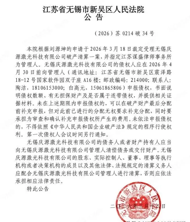 2026年3月18日,无锡市新吴区人民法院正式裁定,受理无锡庆源激光科技有限公司破产清算申请,这家深耕激光设备行业15年的企业,彻底走到了终点,也给整个激光制造行业,敲响了最残酷的生存警钟。