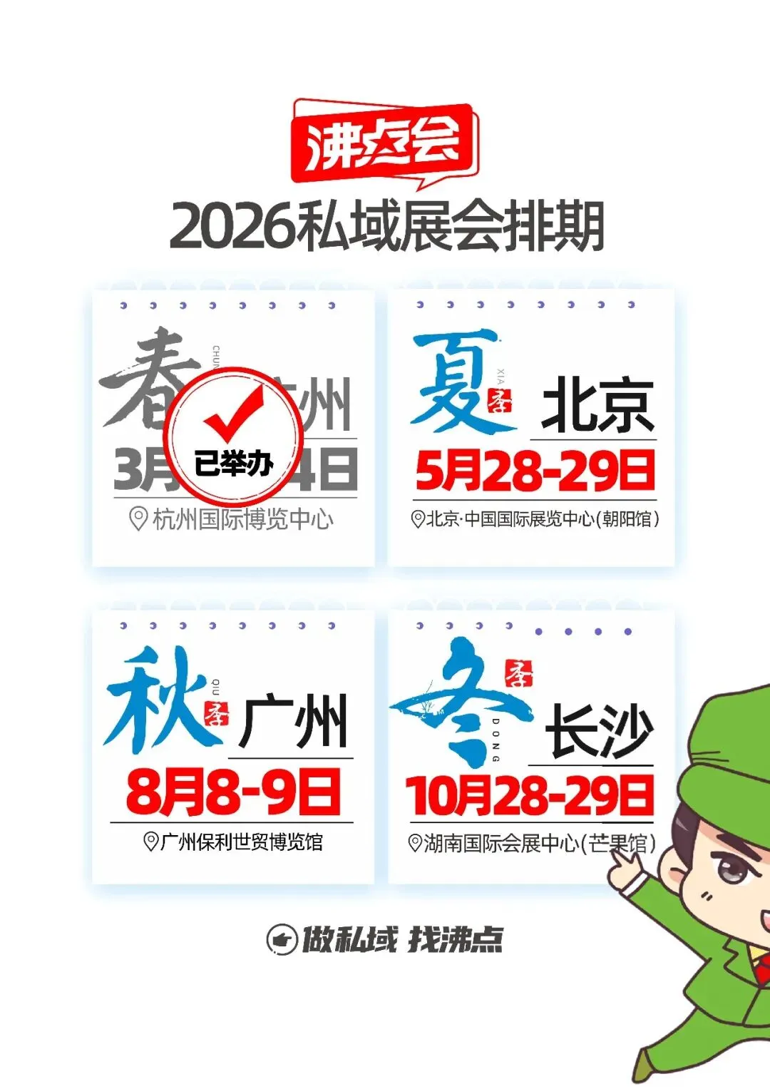 被喻为「私域风向标」的沸点会,深耕私域12年,早已摸清行业增长逻辑——2026年,围绕全国七大区布局四季四城,用四场高规格私域团长展会,帮商家打通全国市场,帮渠道筛选全域好物,破解私域增长困局核心排期速览(收藏不迷路)