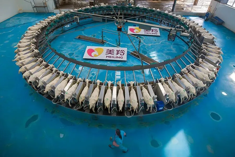 点评:俯拍呈现完美的圆形对称构图,奶羊与设备环绕排列,形成强烈的几何秩序与视觉韵律,画面极具冲击力与现代感。纯净科技蓝为主调,与洁白奶羊形成鲜明而柔和的对比,色彩明快和谐,传递出智慧养殖的科技感,尽显现代农业的高效与创新。