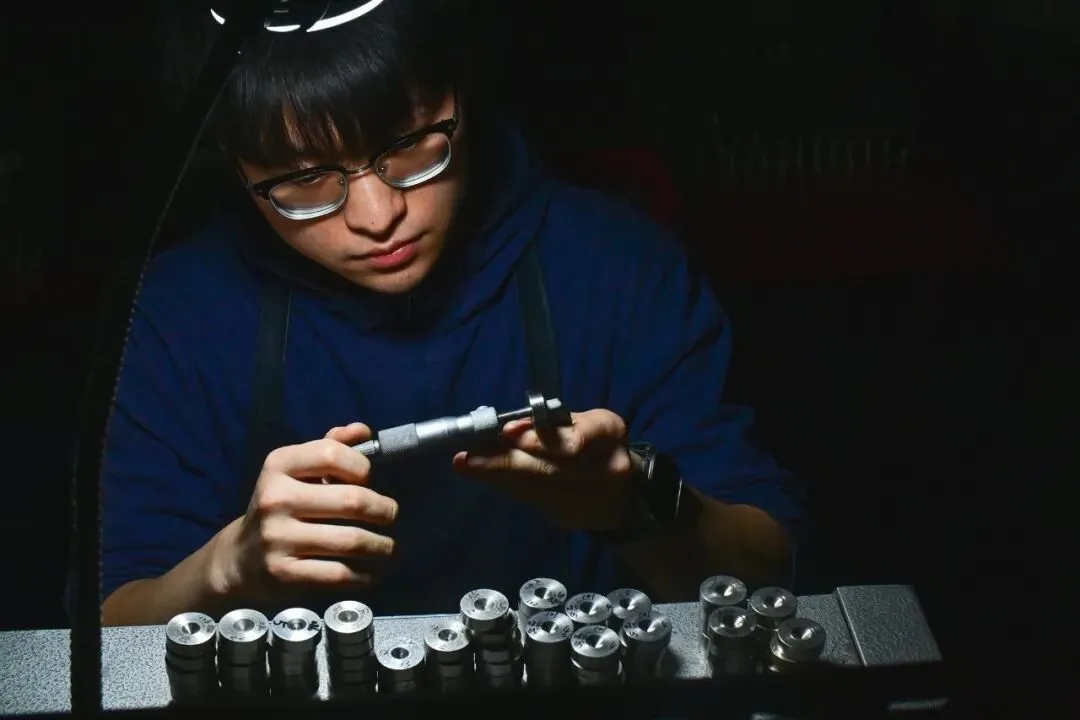 点评:定向侧光精准照亮人物面部与精密工具,形成强烈的质感对比,深蓝服装与银灰金属的冷调和谐统一,沉稳高级,传递出工业质检的专业与冷静氛围。青年工人全神贯注的质检瞬间、细微动作尽显匠心,展现新时代产业工人精益求精的职业素养。