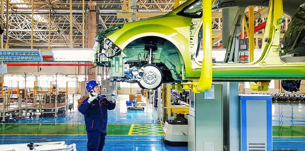 点评:高饱和的亮黄色车身在蓝绿地面、深蓝工装的衬托下得到突显,精准传递新能源产业的活力与科技感。对称式纵深构图,生产线与钢架结构形成规整的几何线条,悬浮的车身与工人形成动静对比,画面开阔且层次分明,尽显现代智造的秩序之美。