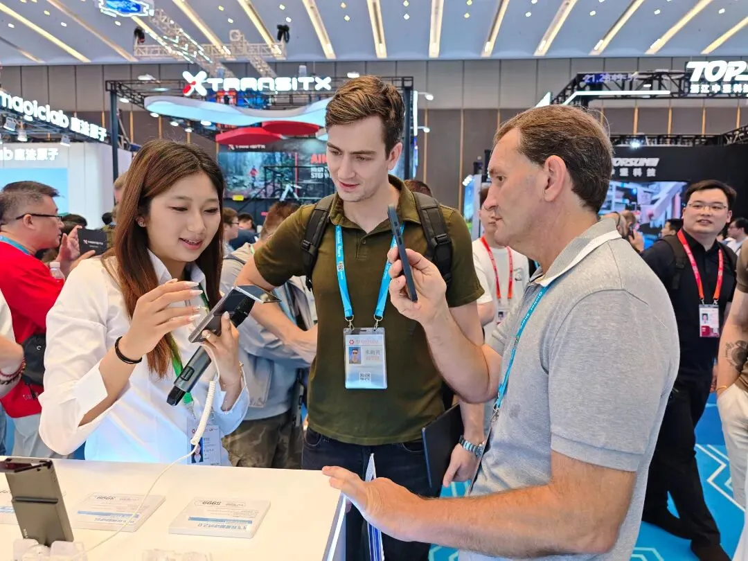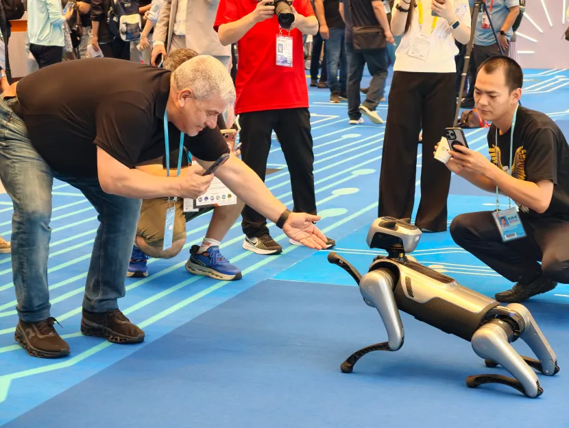 外国客商与机器狗互动。信息时报记者 李馨 摄