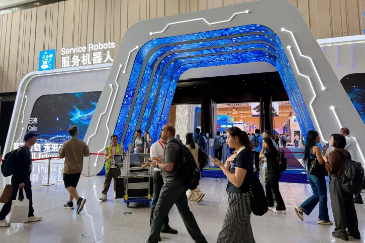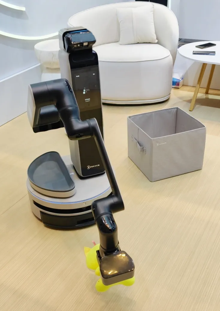 在科沃斯的展区,一台搭载灵活机械臂的机器人正在演示从地面拾起散落的玩具并归类放入收纳盒,动作流畅而精准。
