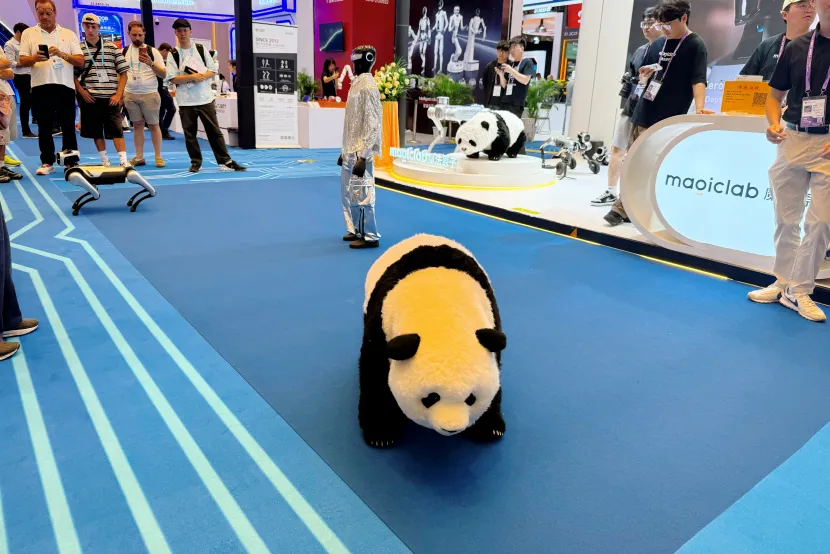 在魔法原子展位前,萌趣的机器熊猫、机器狗同台跳起街舞。记者了解到,这款机器熊猫与今年春晚宜宾分会场献舞的为同一款。现场工作人员介绍,魔法原子在机器狗本体上引入三自由度头部驱动方案,以实现其本体与熊猫外覆件、电机模组之间的机械耦合关系,让机器熊猫能够实现自然歪头转动。