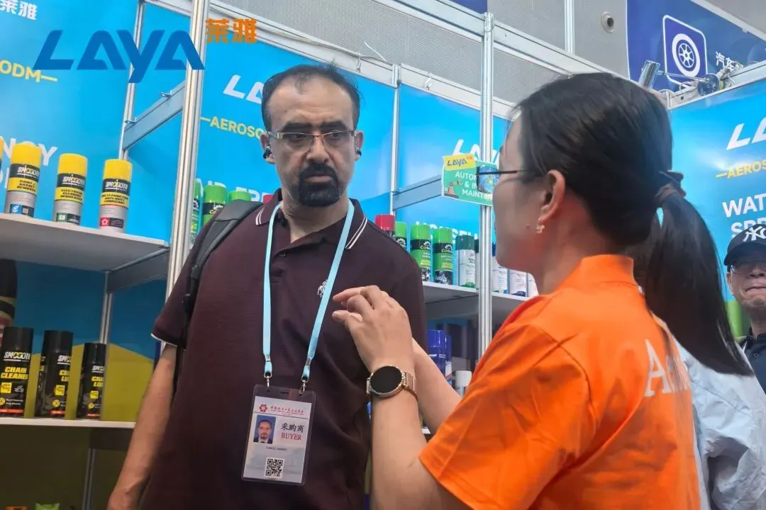 莱雅在汽车配件展区和新材料及化工用品展区的双展位凭借丰富多元的气雾剂展品矩阵,吸引了来自全球各地的采购商前来咨询。