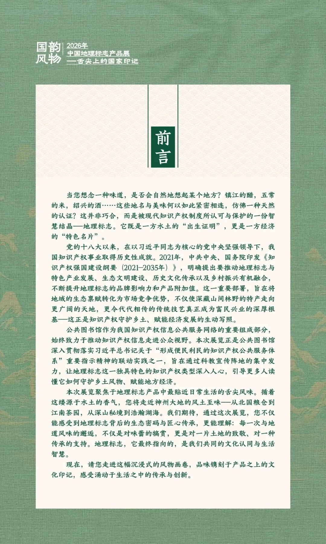 展览聚焦食品类地理标志产品,围绕粮、果、茶、酒、禽、调、油、点等九大类别,精选全国代表性产品进行图文展示。内容涵盖地理标志知识、法律保护、真伪鉴别、馆藏资源推荐等板块,兼具知识性、趣味性与互动性。