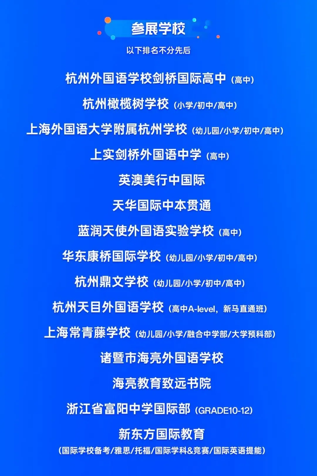 本次展会集中整合沪杭优质教育资源,汇聚数十所标杆名校同台亮相,涵盖公办国际部、民办双语学校、一贯制学校、双轨升学特色校、国际化高中等多元办学形态,全面覆盖幼升小、小升初、初升高、高中转轨及中本贯通等全年龄段择校需求。