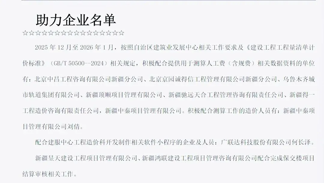 2025年12月—2026年1月,公司严格遵照自治区建筑业发展中心工作部署及《建设工程工程量清单计价标准》(GB/T 50500—2024)要求,主动提供精准详实数据资料,全力支撑行业造价测算工作。
