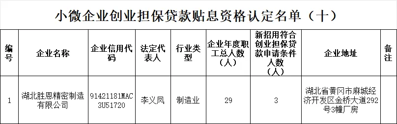 为进一步优化营商环境,持续释放创业带动就业的倍增效应,切实解决小微企业“融资难、融资贵”问题,根据国家统计局关于印发《统计上大中小微型企业划分办法(2017)的通知》(国统字〔2017〕213号)、财政部《普惠金融发展专项资金管理办法》(财金〔2023〕75号)及省财政厅《关于明确创业担保贷款财政贴息有关政策标准的通知》(鄂财金发〔2023〕34号),现对2026年度第十批小微企业创业担保贷款贴息资格认定已审核通过的1家企业名单进行公示。如发现有企业不符合相关政策规定,请向麻城市劳动就业服务中心反映,经认定公示不存在异议的小微企业名单将提交至下一步流程审核。