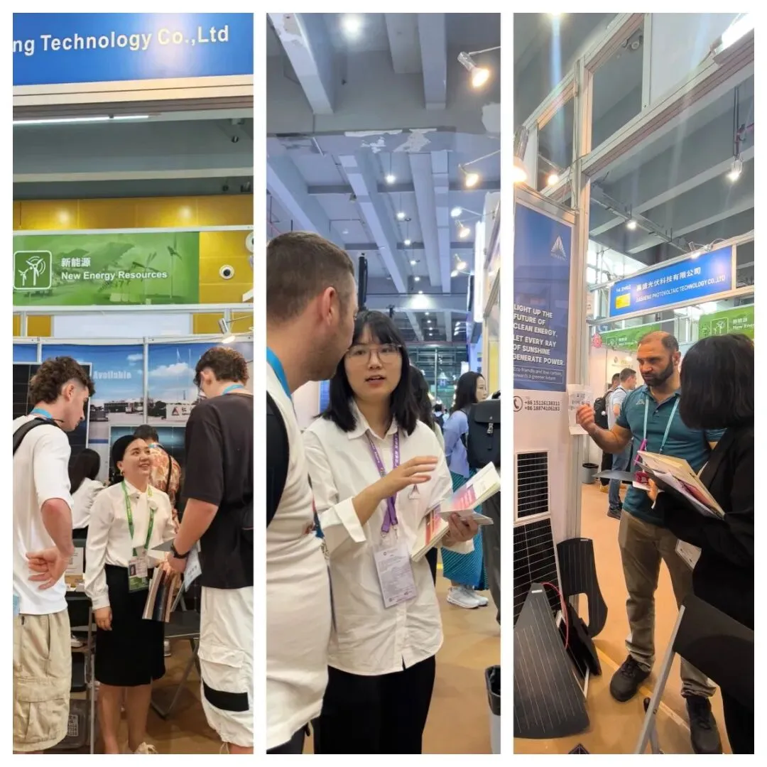 开展首日,仁江光伏展位便成为全场焦点。本次展会,企业重点推出了两款明星产品:一是大功率N型TOPCon组件,转换效率突破23.5%,适配大型地面电站及分布式项目,可降低度电成本10%以上;二是轻质折叠组件,采用超薄柔性封装技术,重量仅为传统组件的40%,可灵活应用于屋顶、车棚、移动能源等场景,解决了传统光伏安装难、运输成本高的痛点。两款产品凭借“高效、轻便、智能”的突出优势,吸引了来自德国、巴西、印度、沙特等国的采购商驻足咨询。展位现场人头攒动,商务团队与客商就产品性能、合作模式展开深度交流,更有海外客户表达合作意向,现场氛围热烈火爆。