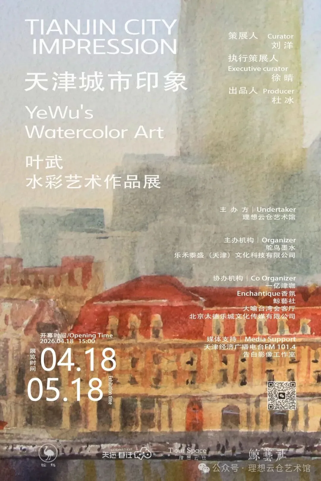 我们荣幸地宣布,天津城市印象 X 叶武水彩艺术作品展,将于2026年4月18日15:00,在理想云仓艺术馆正式开幕!
