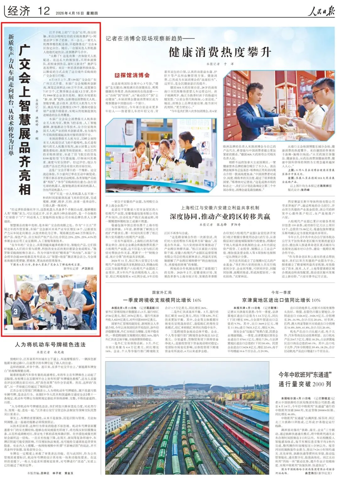 智慧展品的集中亮相,是本届广交会的亮眼之处。作为“十五五”开局之年的外贸首展,本届广交会新兴未来产业专区增至18个,让新质生产力从车间走向展台、从技术转化为订单。现场展出的465万件展品中,新产品、绿色产品、自主知识产权产品占比分别达23%、22%、25%,61%的参展企业应用工业互联网、人工智能等新技术。