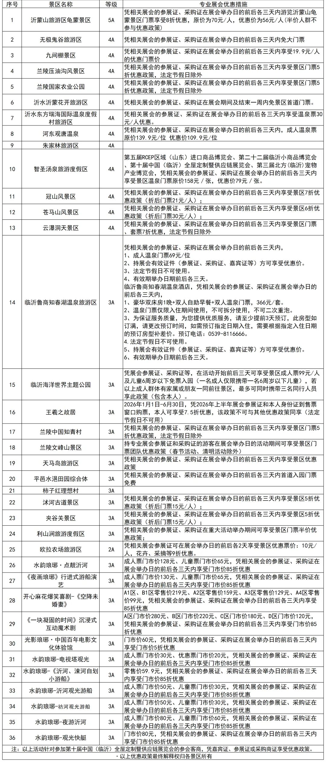 为迎接八方客商,展会期间及前后三天,临沂多家知名景区、文旅项目专为参展商、采购商推出专属优惠。凭展会嘉宾证、展商证、采购商证等有效证件,即可享受门票减免、折扣等重磅福利,轻松畅玩沂蒙山水、探寻琅琊文脉。