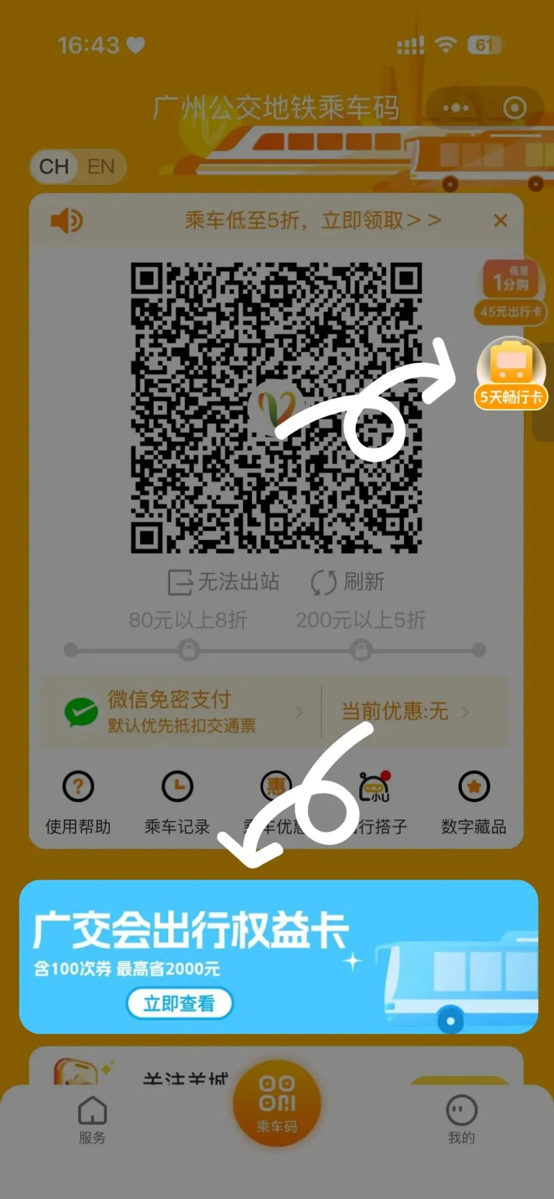 ✅在乘车码页点击二维码右侧浮标,或页面下方的活动轮播图