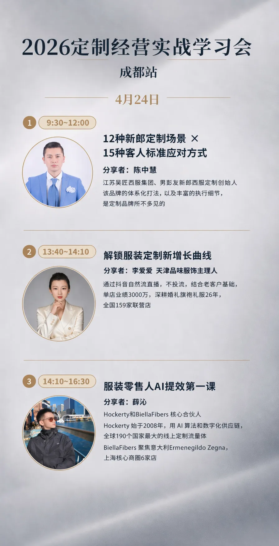 4月24日的成都站则聚焦于新郎装运营、联营、AI主题。