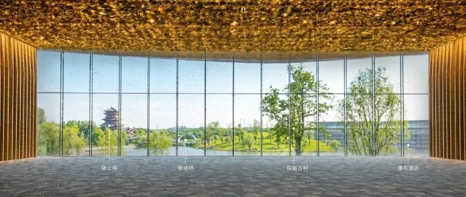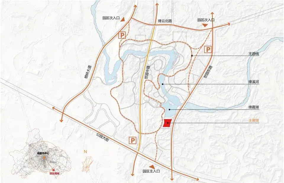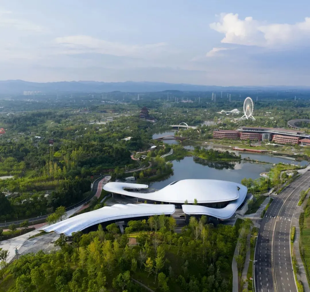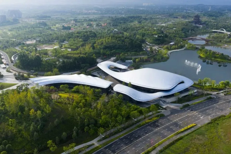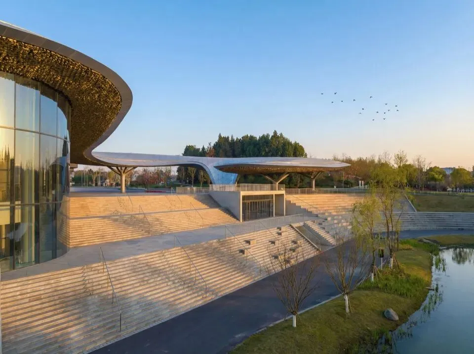 项目总建筑面积约2.3万㎡,主要包含容纳1000人的多功能演艺厅、展览、配套商业及办公用房等功能。主展馆不仅是一座承载国际盛会的功能场所,更是一次现代人对川蜀自然与人文环境认知的在地性建构。设计尊重场地的自然环境,以贴近自然的尺度和形体语言,融历史人文要素,积极呈现现代公共建筑的社会属性。