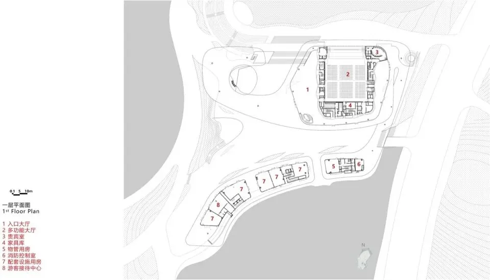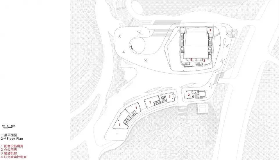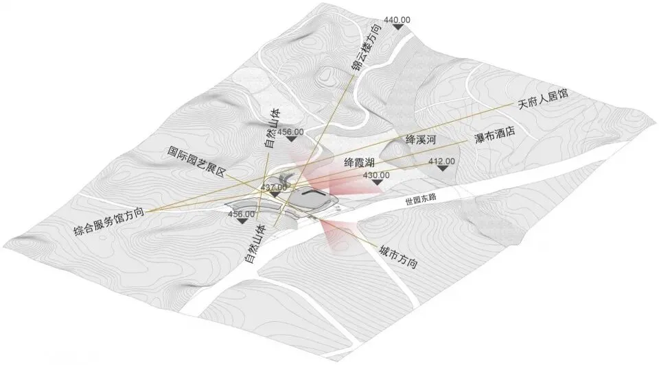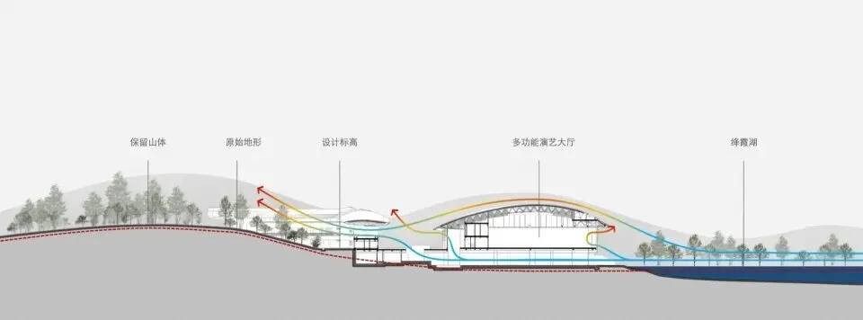 主展馆项目用地位于两山之间的浅丘谷地,北侧绛霞湖湖面最窄处仅为85m,场地内最大高差达26m。在相对狭窄的山水环境中,建筑体量无疑是一个“巨构”,设计基于环境融合理念、尺度控制要求、滨水建筑亲水特点及对现状自然环境资源的理性分析,将约1.2万㎡的展厅、文化艺术活动、配套车库等功能滨水(绛霞湖为人工泻湖)设置于场地北侧的滨水处,节省土方填挖的同时形成北侧亲水界面,并以多级观景台阶看台过渡,形成多个不同标高的观景平台。在东侧结合地形形成“双首层”入口,为城市提供多场景使用的交通流线。消解的形体以更好的尺度嵌入原始地形中,看见建筑也见山水。