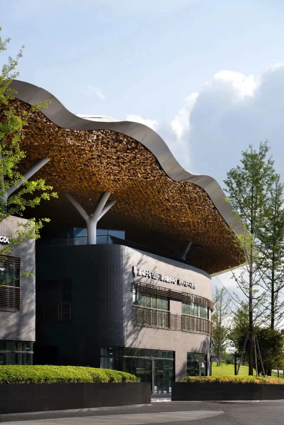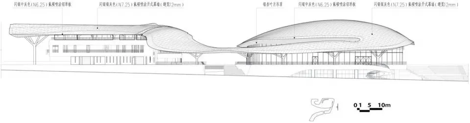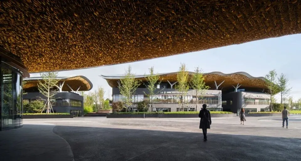 结合施工技术、造价、工期及地域文化表现等因素的综合考量,对“金属银杏叶片”的尺度、疏密、层次、颜色、灯光、构造方式等进行设计,以和谐出彩的方式呈现人文新景观。通过对材料性能的熟悉掌握,用铝单板材料实现屋面多变曲面的塑形。主动技术包含化小空调系统,提供运维节能的灵活控制;采用电动开启通风窗进行气流组织,实现自然通风等。广场铺地大量使用透水混凝土,立体化布置形态丰富的草坡与树池,融入自然的同时提供微环境的韧性和舒适。