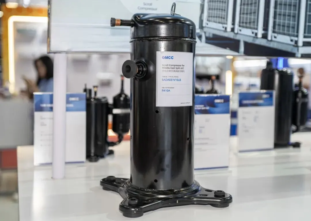 除家用空调外,美芝现场还展示了应用于T3工况(适用于最高环境温度52°C的热带气候)的家用及商用领域的转子式压缩机、涡旋式压缩机等产品。如针对中东等高温干燥地区的严苛运行环境,美芝针对性推出中东分体空调涡旋压缩机。在高温环境下,该压缩机制冷能力显著优于常规活塞机型,能效比高出6%~8%,保障用户在酷热季节的拥有舒适体验。