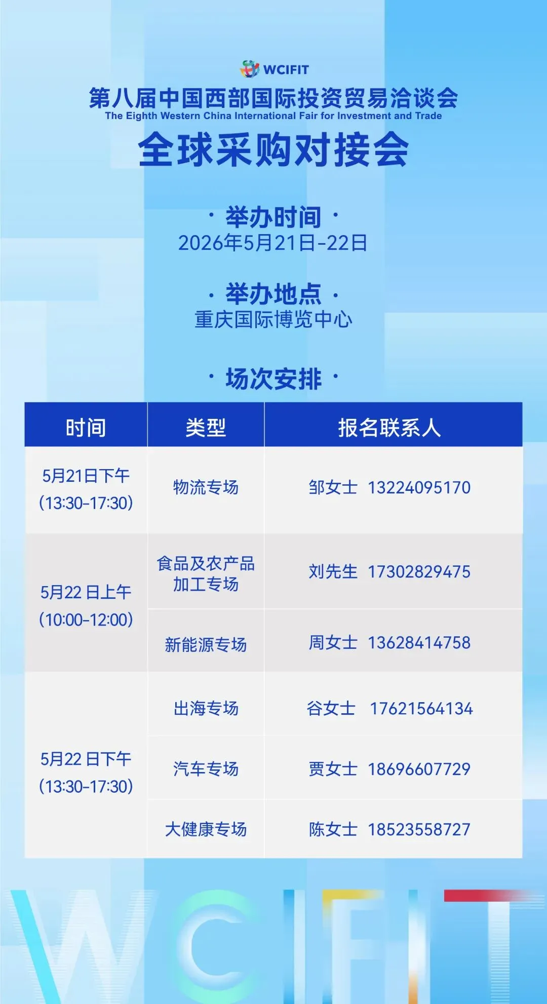 第八届西洽会将于2026年5月21—24日在重庆国际博览中心和重庆悦来国际会议中心举办。以“新西部 新制造 新服务”为主题,分设综合形象展区、生产性服务业展区、产业融合发展展区、国际和区域合作展区4大主题展区,预计展览面积11万平方米。为积极发挥“走出去”与“引进来”的开放性平台作用,全球采购对接会将与第八届西洽会同期举办。