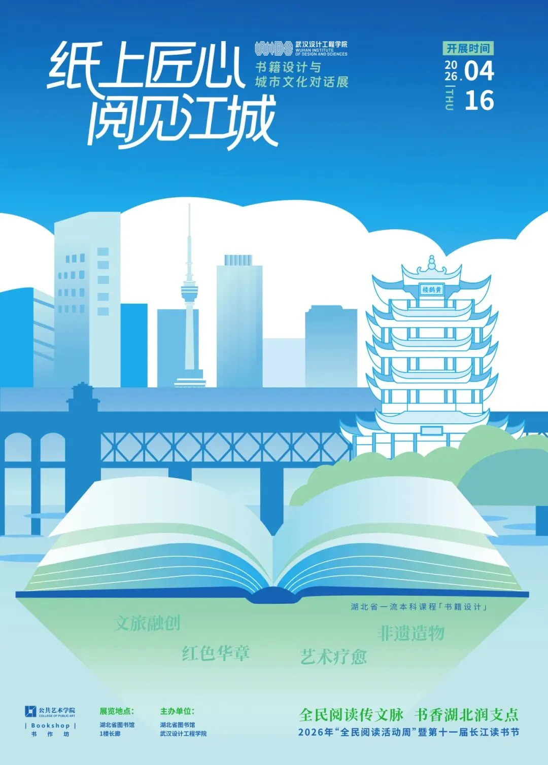 4月16日,作为中共湖北省委宣传部、湖北省文化和旅游厅主办的“全民阅读传文脉 书香湖北润支点”2026年“全民阅读活动周暨第十一届长江读书节”分支活动,“纸上匠心 阅见江城——武汉设计工程学院书籍设计与城市文化对话展”在湖北省图书馆正式开展。