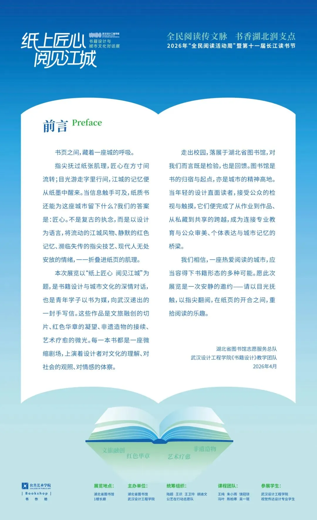 感谢湖北省图书馆志愿服务总队给予的全方位支持,感谢我院“公艺在行动志愿队”,他们以热忱为针、以耐心为线,将这场关于书与城的对话,一页一页装订进每一位观者的记忆里。感谢每一位参与者!