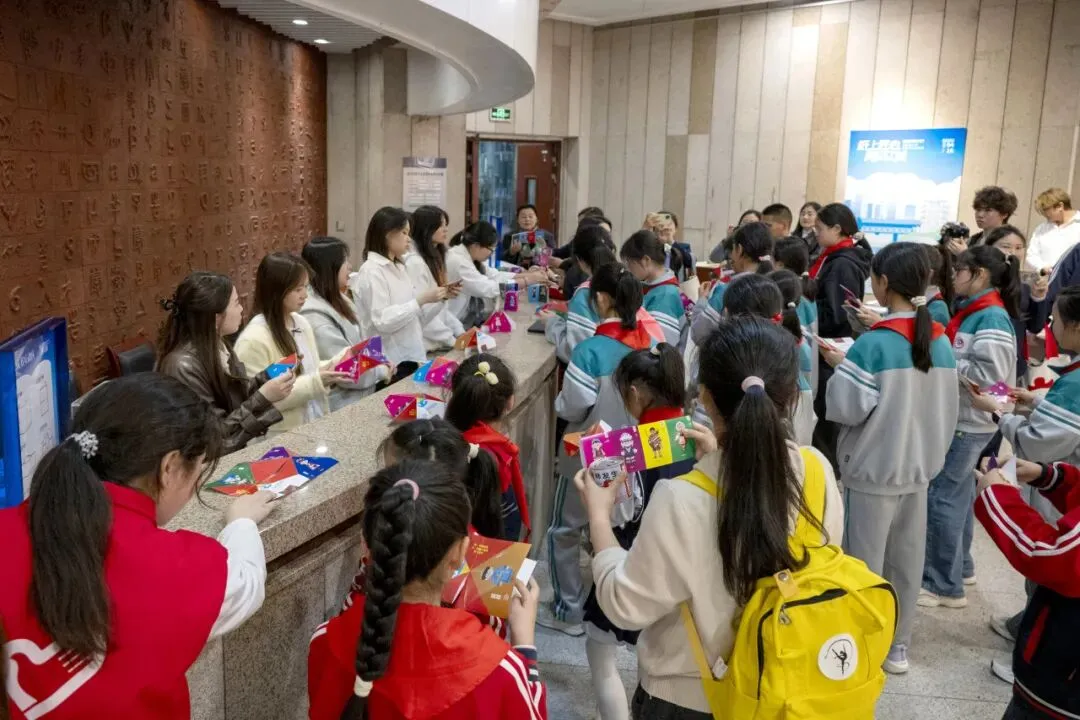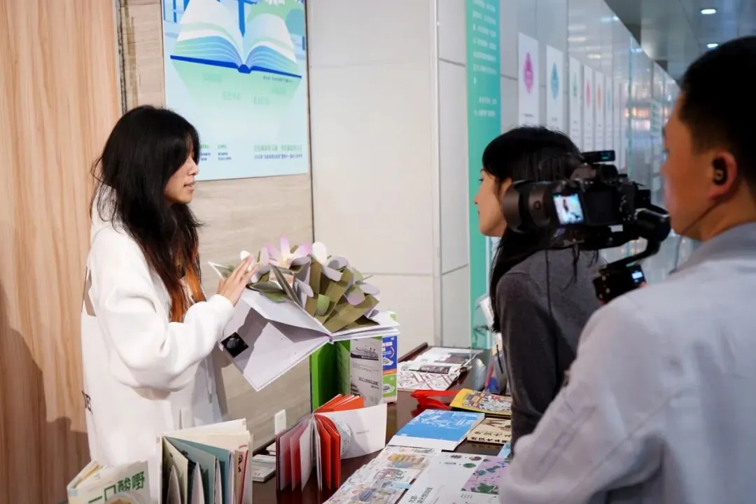 展览特别设置了“一纸成书”互动体验区,准备了多款折纸小书材料。活动一开始便备受欢迎,几波小朋友围聚体验,兴致满满,折纸材料很快被一抢而空。只用一张A4纸,通过简单翻折,就能做出一本迷你小书。在轻松有趣的动手过程中,感受书籍结构的精巧与纸张变身的奇妙。设计从课堂走进现场,成为看得见、摸得着、玩得尽兴的创意乐趣。