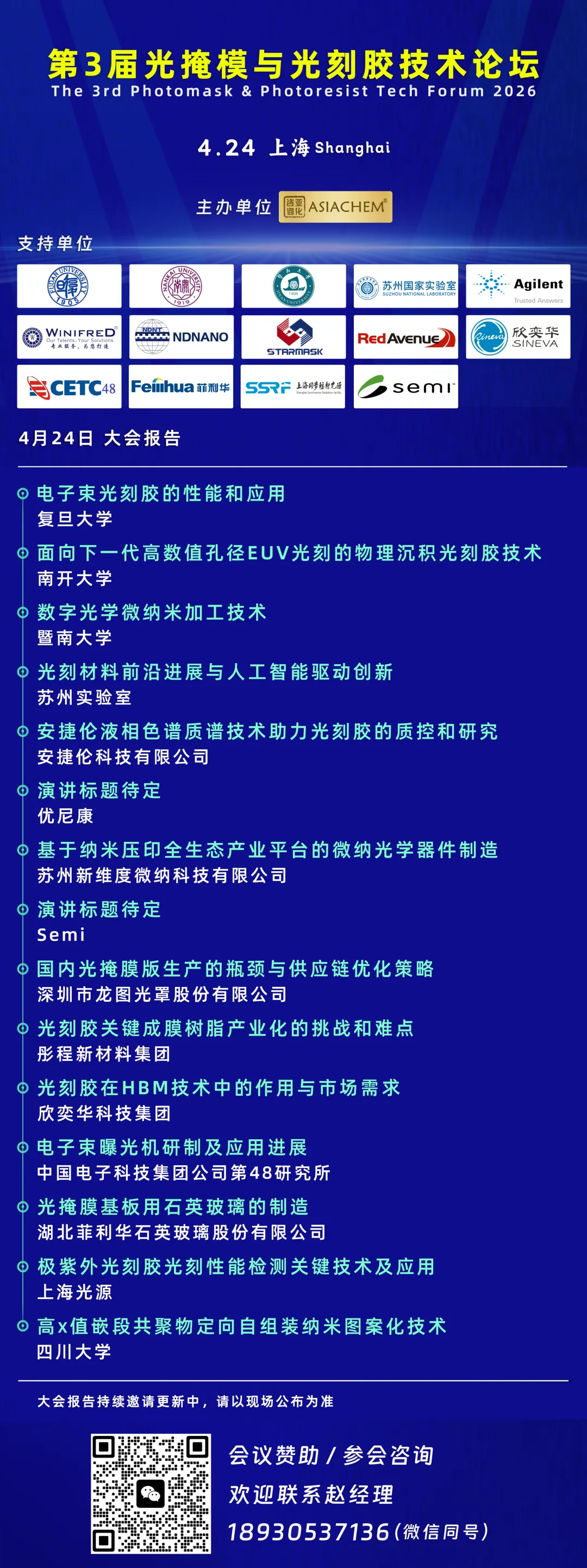 来自彤程,龙图光罩,SEMI,复旦大学,南开大学,暨南大学,苏州实验室,欣奕华,中电科48所,安捷伦,湖北菲利华,新维度微纳等单位的专家将作精彩报告