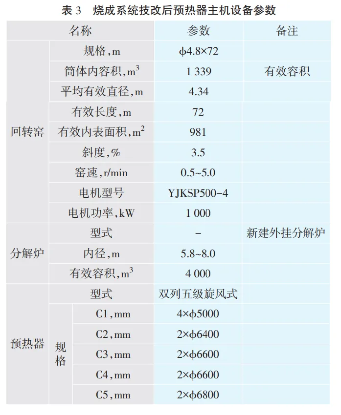 某5000t/d水泥熟料生产线烧成系统原采用双系列五级预热器系统、三喷腾分解炉和带空气梁的第三代篦式冷却机。由于生产线运行时间较长,烧成系统存在预热器系统阻力偏高、C1出口温度偏高、窑头部分冷却风机用风不合理、出冷却机熟料温度偏高及热回收效率偏低等问题。结合对现场烧成系统的热工诊断结果,对运行过程中出现的问题进行了技术分析,制定了烧成系统优化方案,并从撒料装置调整、旋风筒扩容、分解炉扩容、更换高效节能风机、更换第四代带中置辊破篦式冷却机等方面开展了技术改造。技改实施后,系统能耗进一步降低,系统阻力减小,换热效率提升,达到了预期技改目标。某水泥公司5000t/d水泥熟料生产线采用无烟 煤燃料,分解炉采用预燃炉加TSD炉,以适应无烟煤燃点高的特性,炉容偏小(约2100m3)。投产后发现,两个预燃炉的煤粉预燃效果有限,物料在分解炉内停留时间偏短,造成分解炉分解率较低,预热器对不同煤种的适应性差,能耗指标不理想。该生产线回转窑规格为ϕ4.8m×72m,熟料冷却机为第三代TC-12102篦式冷却机,出窑熟料温度偏高,能耗损失大。为进一步提高产能,降低能耗及生产成本,公司对该生产线烧成系统进行了优化技改。 2020年,回转窑标煤耗为106.14kg/t,生料喂料量为360t/h,高温风机转速为 790r/min,C1出口负压为-5200Pa。预热器系统通风阻力大,分解炉容积偏小,对原煤适应性差,煤粉燃烧不好,煤耗偏高;篦冷机热回收效率低,出冷却机熟料温度高,约160℃~200℃;第三代篦冷机故障检修频繁,对下游工序的生产维护造成较大影响。2021年3月,该公司对此5000t/d 水泥熟料生产线烧成系统进行了热工标定检测,烧成系统工艺流程如图1所示,预热器热工标定测试数据如表1所示。从表1数据分析可知,系统整体风量偏大(1.46 Nm3 /kg.cl),用煤量偏大;C1出口温度偏高(324℃),负压偏大(-5200Pa);窑内仍存在还原气氛,煅烧强度偏低(NOX-347ppm);篦冷机热回收效率不高,三次风温为884℃,烧成系统有较大优化空间。烧成系统热量平衡表的支出热量分布统计如表2所示。由表2可知,熟料形成热约占总热耗的55.1%,基本由原料及其配料方案所决定,降耗空间不大。因此,需从降低预热器系统热损失、冷却机排放废气热损失、烧成系统表面散热损失、出冷却机熟料热损失等方面进行技改。5000t/d 及2500t/d典型熟料生产线热损失分布见图2。 该项目烧成系统技改实施流程如图3所示。技改目标为改善预热器系统的气固换热效果,降低系统压力损失,提高系统分离效率;同时,将分解炉炉容增加至4000m3,为煤粉燃烧及生料分解提供足够的空间和时间;提高冷却机热交换率及设备运转率,为烧成系统长期稳定运行提供保障。预热器系统的阻力损失为各级旋风筒的压力损失与系统管道压力之和,即,最低级旋风筒进口至最高级旋风筒出口压力总损失差。预热器系统压损 每降低500Pa,可节省电耗0.66~0.77kW·h/t。烧成系统技改后预热器主机设备参数见表3。结合水泥生产线预热器改造目的,对预热器旋风筒、连接风管、撒料盒等设备的结构尺寸进行核算,对旋风筒内筒、旋风筒进口、风管有效截面积、撒料盒底部斜坡等进一步优化,拓宽预热器对原、燃料的适应性,实现提产降耗。(1)增加预热器C1~C5旋风筒蜗壳高度,同时增加相应旋风筒内筒高度,以提高旋风筒分离效率,尽可能降低系统阻力。(2)C1料管采用双道锁风阀,提高其锁风效果,降低C1出口温度。(3)采用纳米隔热保温材料,降低技改部分表面温度。(4)采用新型撒料盒,提高管道换热效率,优化系统运行。旋风筒和撒料盒改造如图4、图5所示。 在塔架外分解炉现有基础上增加一柱体,调整C5旋风筒蜗壳,用下行出炉延伸管道连接C5旋风筒和分解炉,可适当增大分解炉容积。另外,可通过C4下料,灵活调整分解炉主燃烧区流场温度。在可利用的空间内尽量增大原塔架内分解炉容积,延长物料停留时间,有利于煤粉的燃尽及出炉物料分解率的提高。 将第三代冷却机更换为第四代带中置辊式破碎机的冷却机,如图6所示。第四代冷却机的设备故障率明显降低,为烧成系统的长期稳定运行提供了很好的保障。第四代冷却机具有以下优势:(1)采用步进式无漏料输送模式,保证了较高的输送效率。(2)具有创新性篦板与密封结构,第四代冷却机磨损面积仅为第三代的15%,磨损率较低。(3)在全篦床范围内应用稳流控制阀,保证了较高的热交换率。(1)整体更换4个C1旋风筒,总高度9900mm,进口向外、向下扩展,进口面积增大,相应调整连接进风管的接口。(2)C2~C5旋风筒蜗壳部分加高1000mm,缩短柱体部分高度,调整连接进风管的接口,增加下料斜坡,人孔门移位至合适位置。(3)整套更换C2~C5旋风筒内筒挂板及挂片,加长C2~C5内筒。(4)更换入窑生料喂料管、C1~C3下料管及撒料装置,调整撒料板角度,调整下料管。整体更换C4撒料装置、下料管及C5下料管。(5)新增分解炉,分解炉从烟室拐出预热器塔架,管道上行到5F楼面后转下行,从4F楼面下方转入原TSD炉体,重新调整C4下料管及喷煤点。(6)将三次风改为单侧进风,降低三次风管高度,调整窑尾侧直径,斜度为5°,从窑中支撑后适当位置切断对接,新增脱氮风管。(7)拆除原分解炉、分解炉至C5管道及两侧预燃炉。(10)窑主传电机统一更换为高压交流电机,更换配套的变频器。 (11)拆除原第三代TC-12102冷却机、离心风机等设备设施,在原土建基础上改建、安