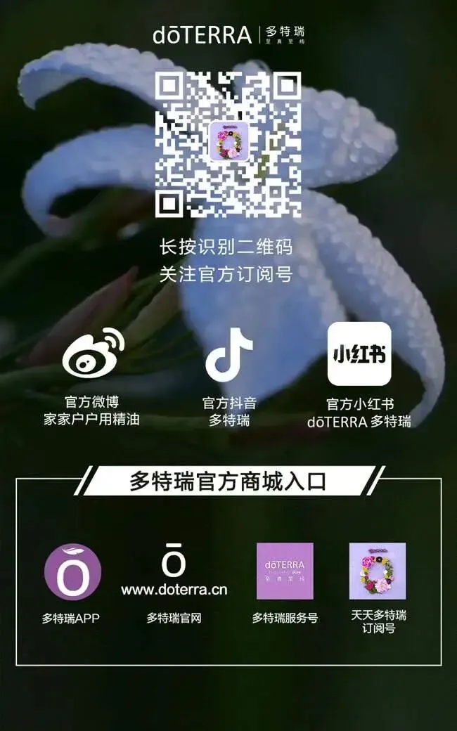 美国dōTERRA多特瑞公司成立于2008年,是全球最大的芳香护理和精油企业之一,产品包括精油和居家生活产品。目前,dōTERRA多特瑞的业务已遍布全球140多个国家和地区,拥有超过1000万名顾客,年营业额近30亿美元。2020年6月多特瑞成为国际日用香料研究所(RIFM)会员,是全球首个加入该组织的的芳香护理和精油企业。