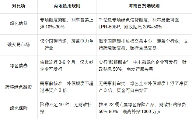 和内地其他绿色金融改革试验区相比,海南绿色金融叠加了自贸港跨境资金流动、税收优惠的专属红利,政策力度远超内地,核心差异一目了然: