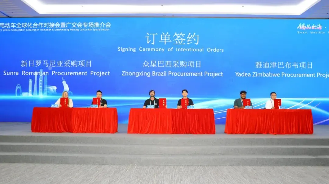 现场,印尼长友集团全球采购总监朱志伟、土耳其—中国商业发展与支持协会主席İhsan BESER、巴西企业协会副会长杰西•吉马良斯发布了广交会采购清单。新日罗马尼亚采购项目、众星巴西采购项目、雅迪津巴布韦项目3个广交会电动车意向订单在进行现场签约。