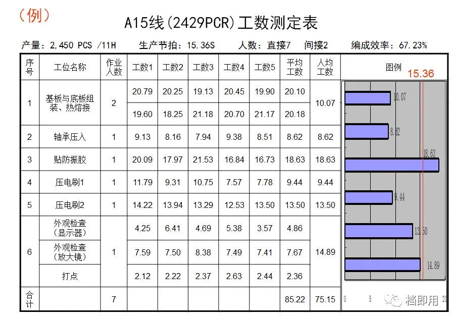 ⑤作成生产线整体的工数测定表,计算出各工位的平均工数和人均工数,并用平衡图表示。