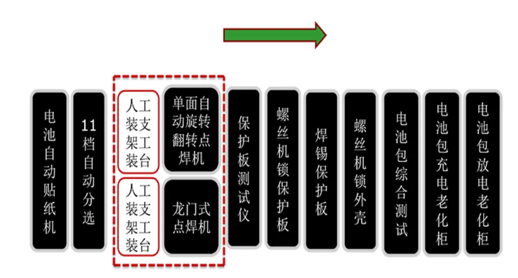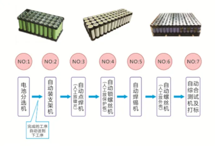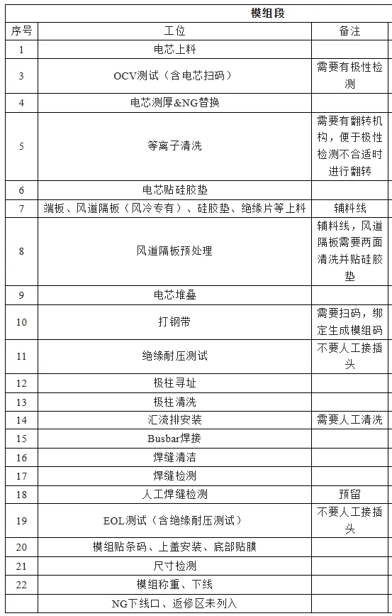 电芯上料—OCV测试及扫码—电芯贴胶及检测—电芯下线极性检测—模组成组—端板组装—模组整形挤压—锁螺丝/套钢带—打印码/贴码—焊前CCD拍照—极柱激光清洗—汇流排组件安装—汇流排激光焊接—汇流排安装夹具下线回流—焊后人工目检及除尘—人工安装线束—EOL测试—上盖安装—模组自动下线