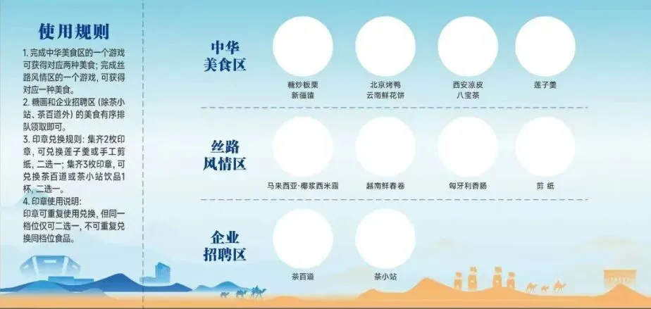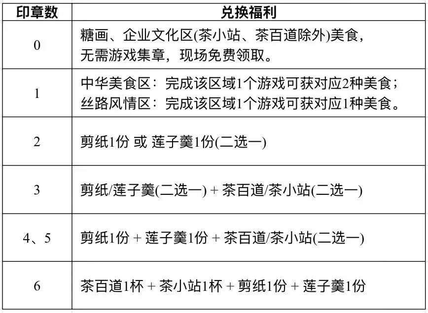 入口处领取门票→参与游戏→获得印章→凭印章兑换相应美食