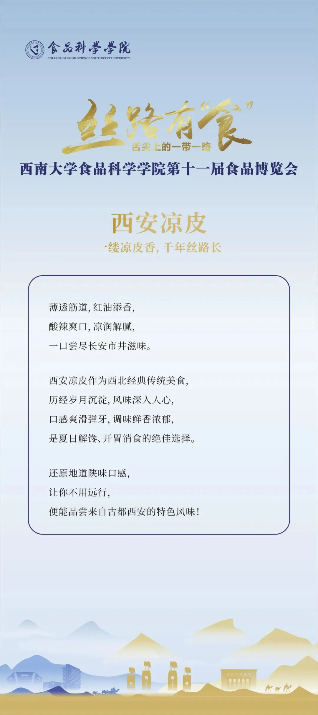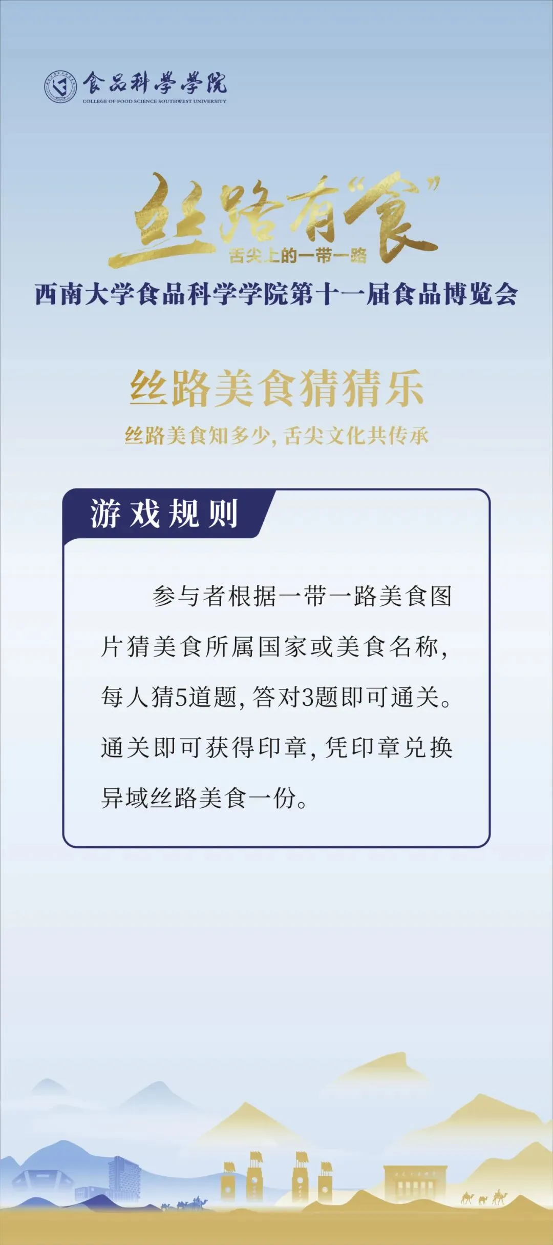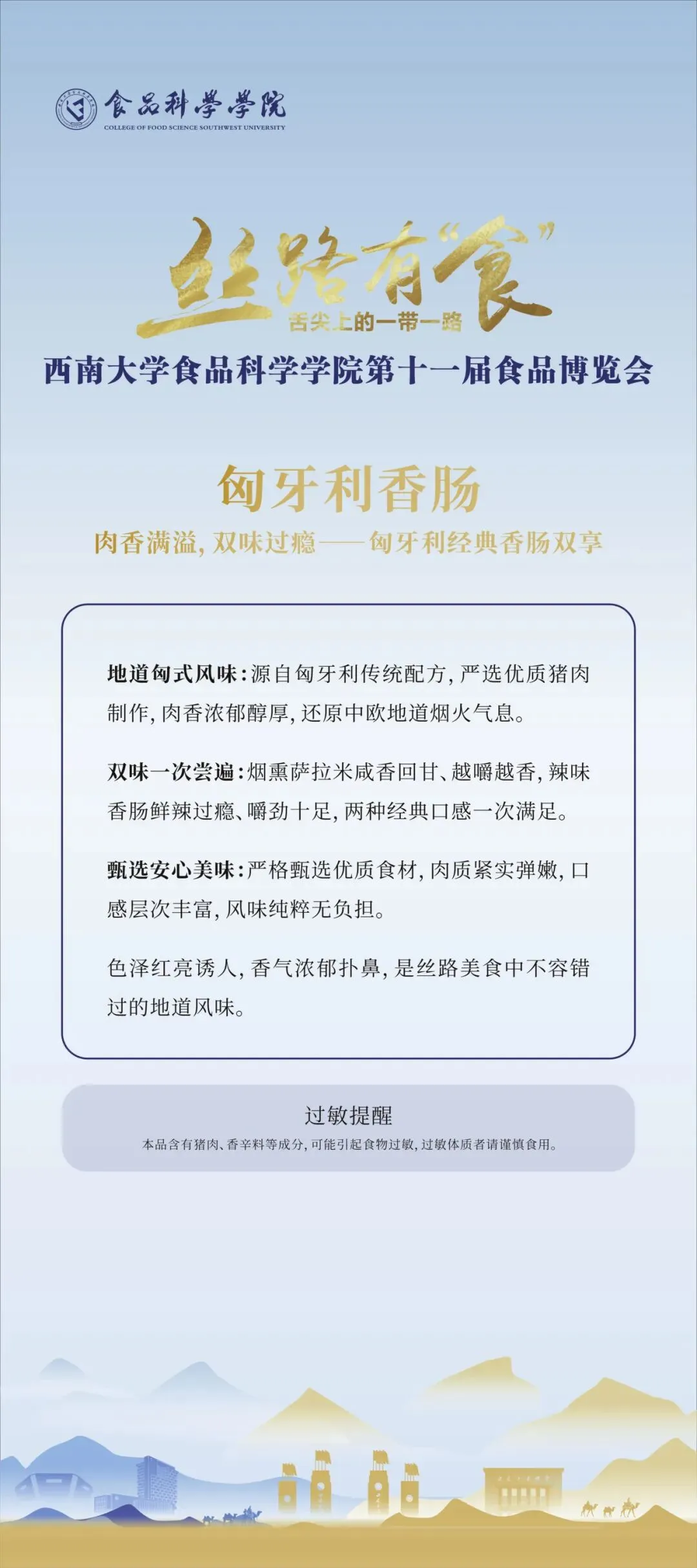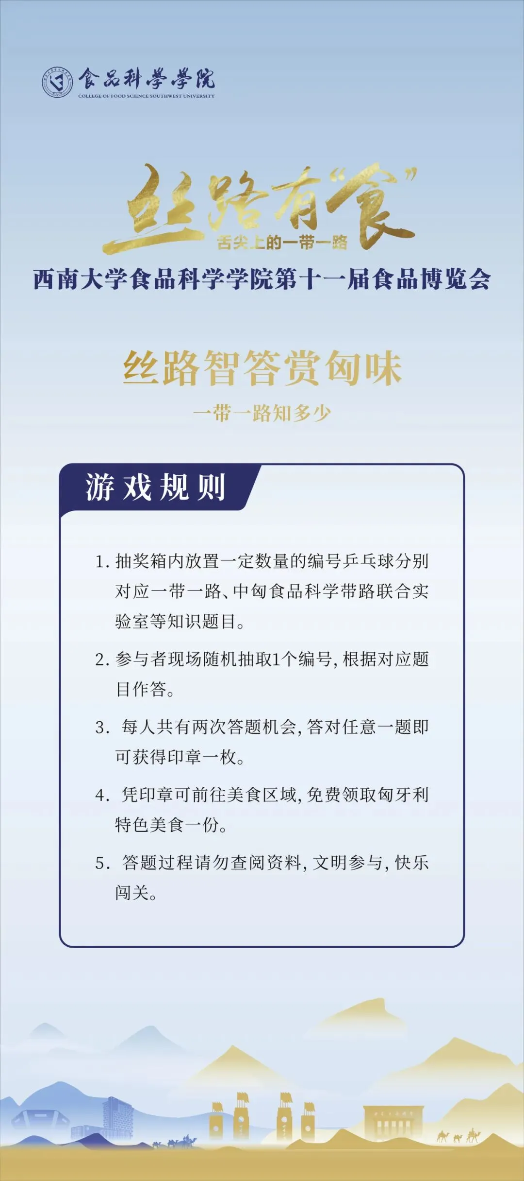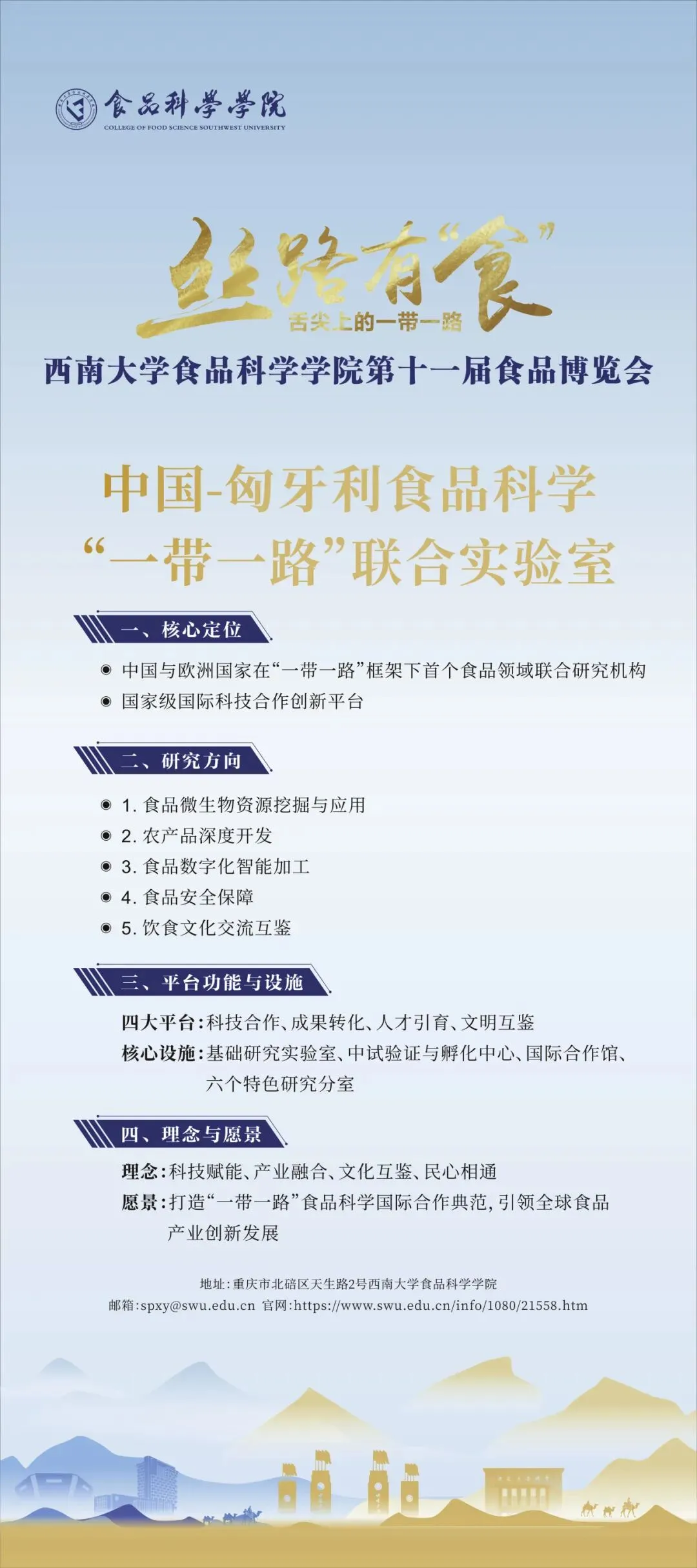 今年是西南大学办学120周年,学校底蕴深厚、成果丰硕。中国—匈牙利食品科学“一带一路”联合实验室启动建设,国际合作再获突破。为赓续百廿文脉、深化丝路合作,第十一届食品博览会以“丝路有‘食’ 舌尖上的一带一路”为主题,融合校庆、丝路美食、中匈合作与校园体验等,联动行业企业搭建产学研交流与就业对接平台,以美食为媒、文化为桥、科技为支撑,献礼百廿校庆、展示国际交流成果,助力食品专业人才培养,让师生感受食品科学魅力与开放办学格局,共庆百廿荣光、共话丝路未来。