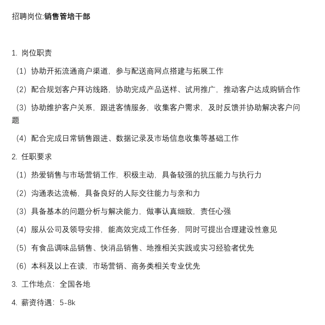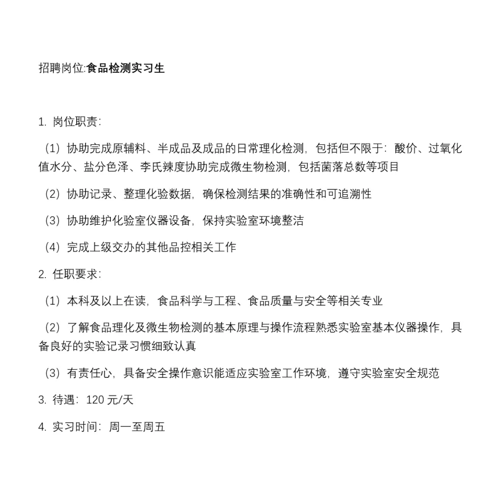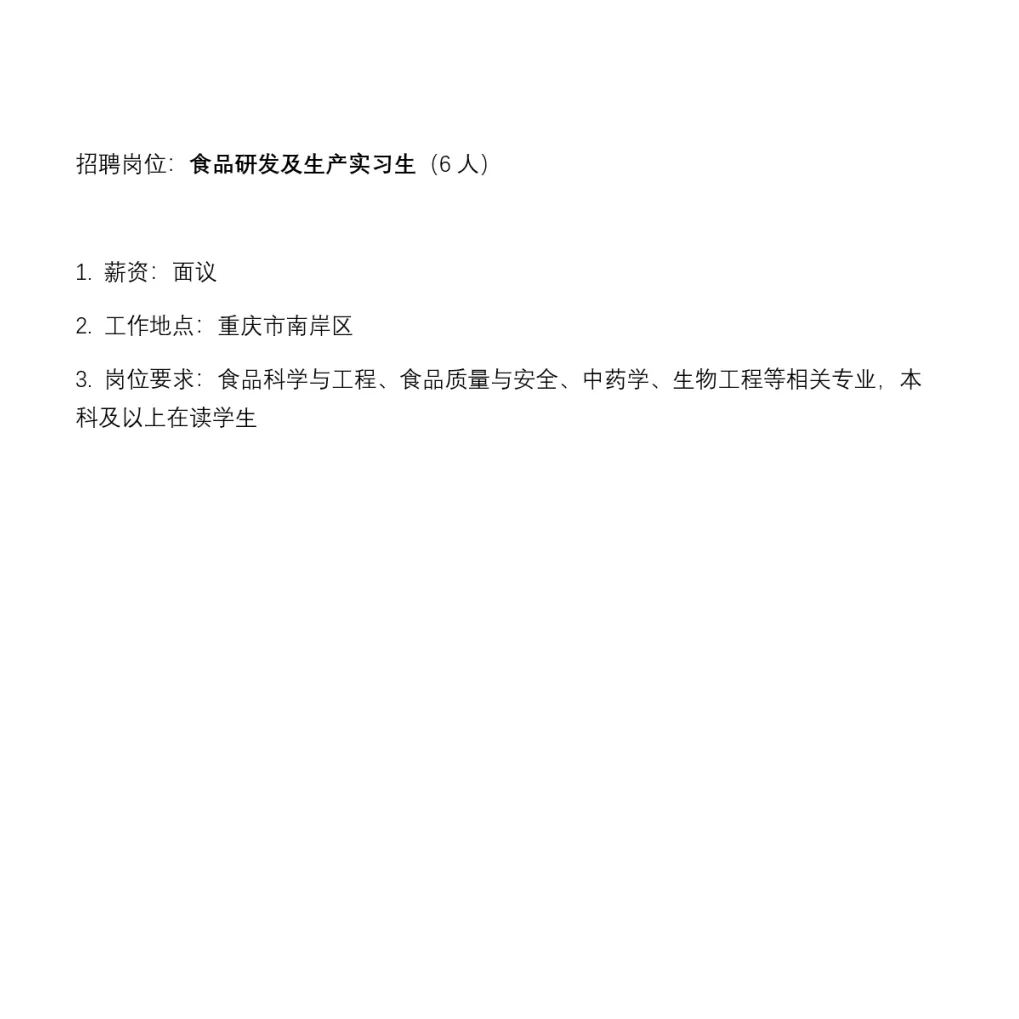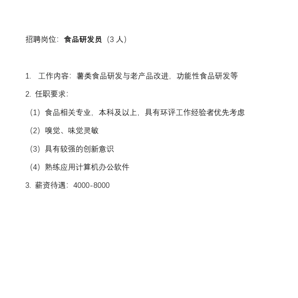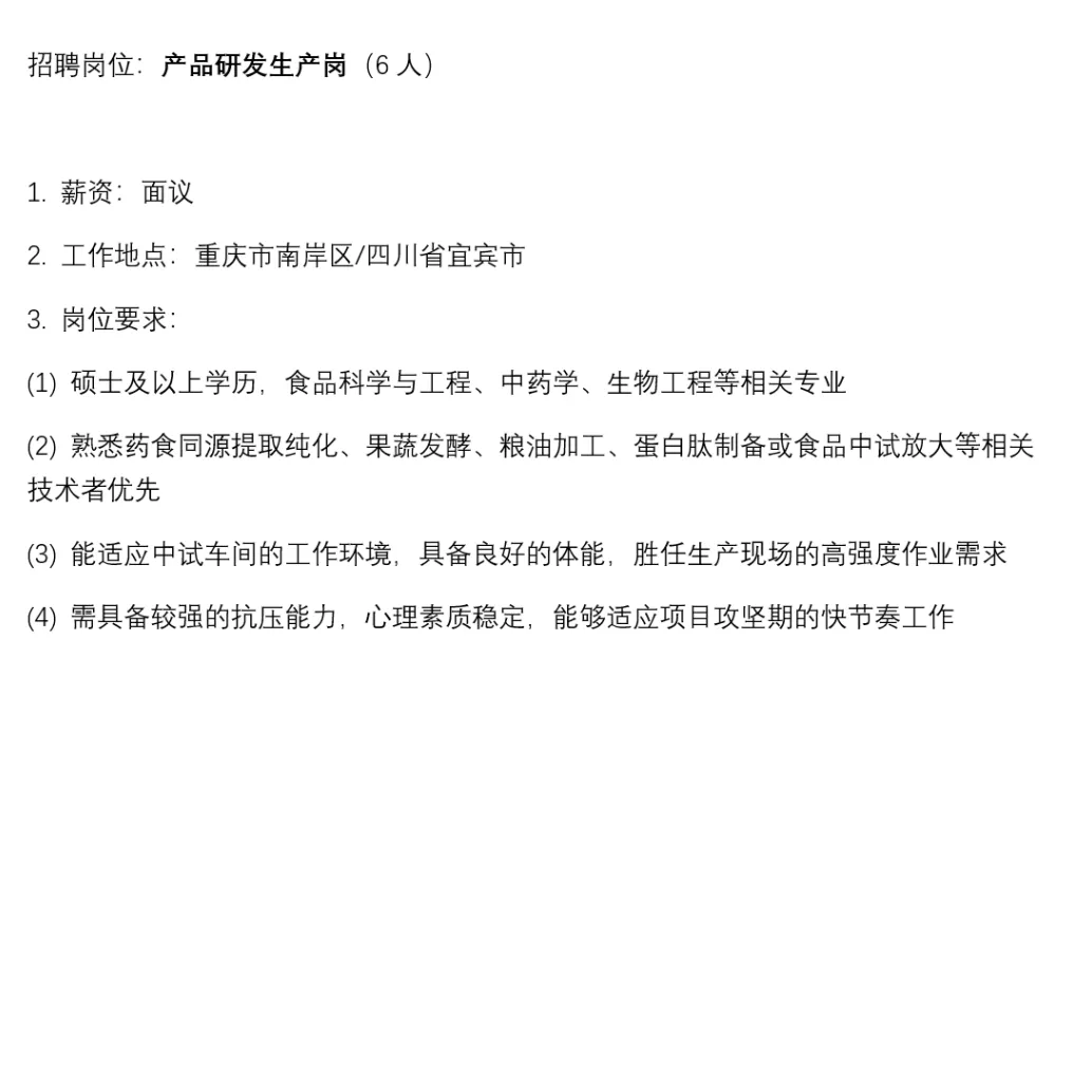 招聘岗位:产品研发生产岗,项目管理人员,食品研发及生产实习生