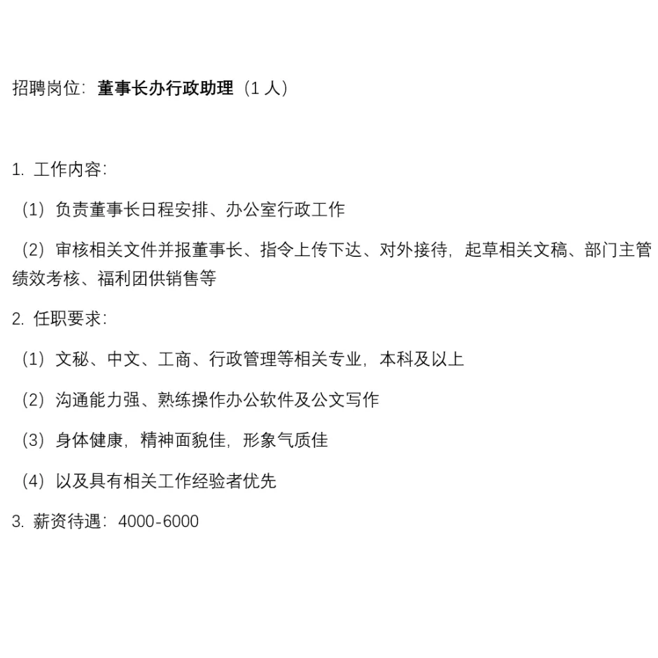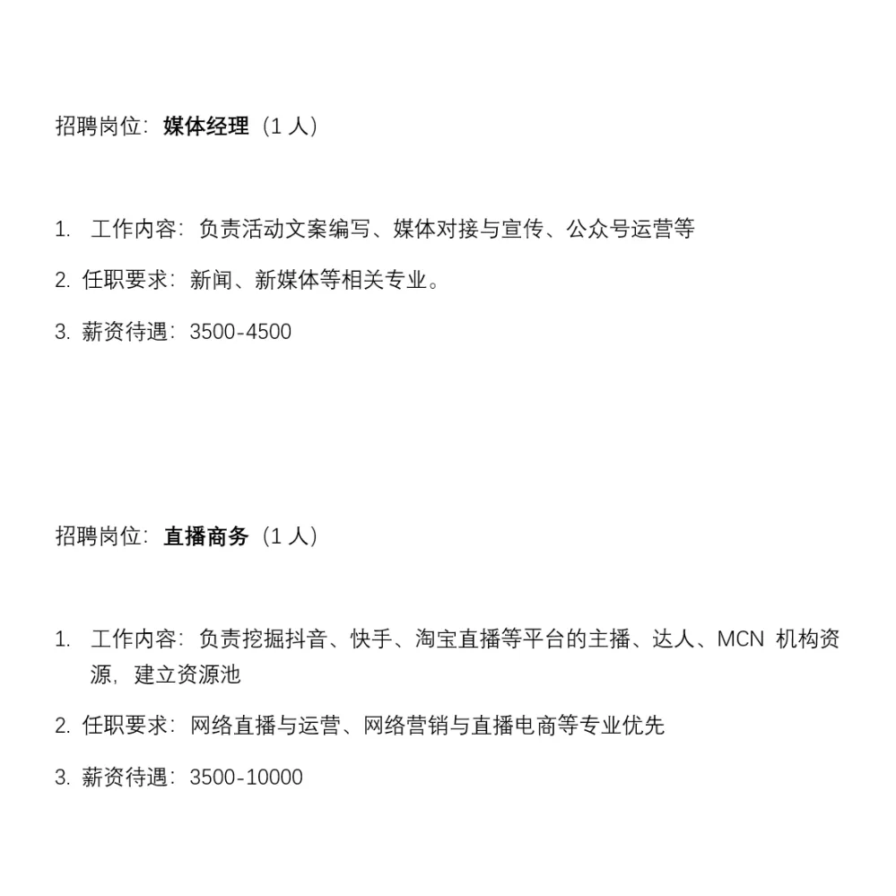 招聘岗位:董事长办行政助理,食品研发员,媒体经理,直播商务人员