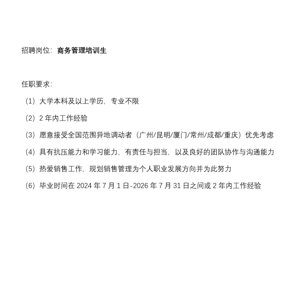 招聘岗位:商务管理培训生(广州/昆明/厦门/常州/成都/重庆)
