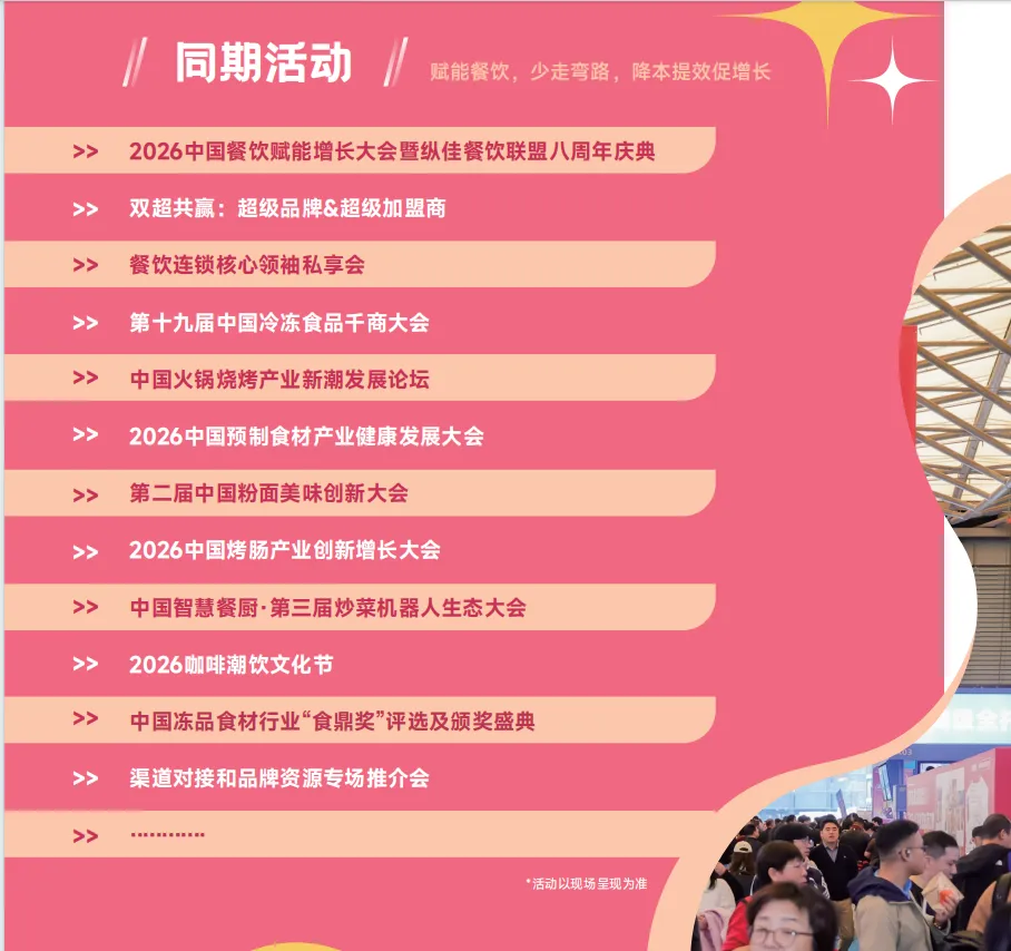 厨房设备、商用智能设备、餐饮器具、桌椅家具、一次性环保餐具、前厅用品、综合解决方案、智慧餐饮技术等同期举办的第十九届中国冷冻冷藏食品博览会、郑州咖啡潮饮文化节暨烘焙甜点及轻餐展览会与 CCFE 同馆联动,形成强大的展会集群效应。这不仅丰富了展会的内容,更为参展商和专业观众提供了更为全面的交流与合作机会。