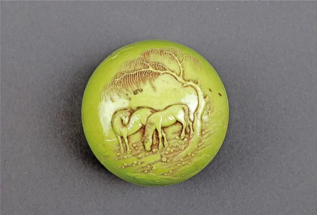 泰安市博物馆藏 清光绪 绿釉雕瓷双马纹瓷印盒
