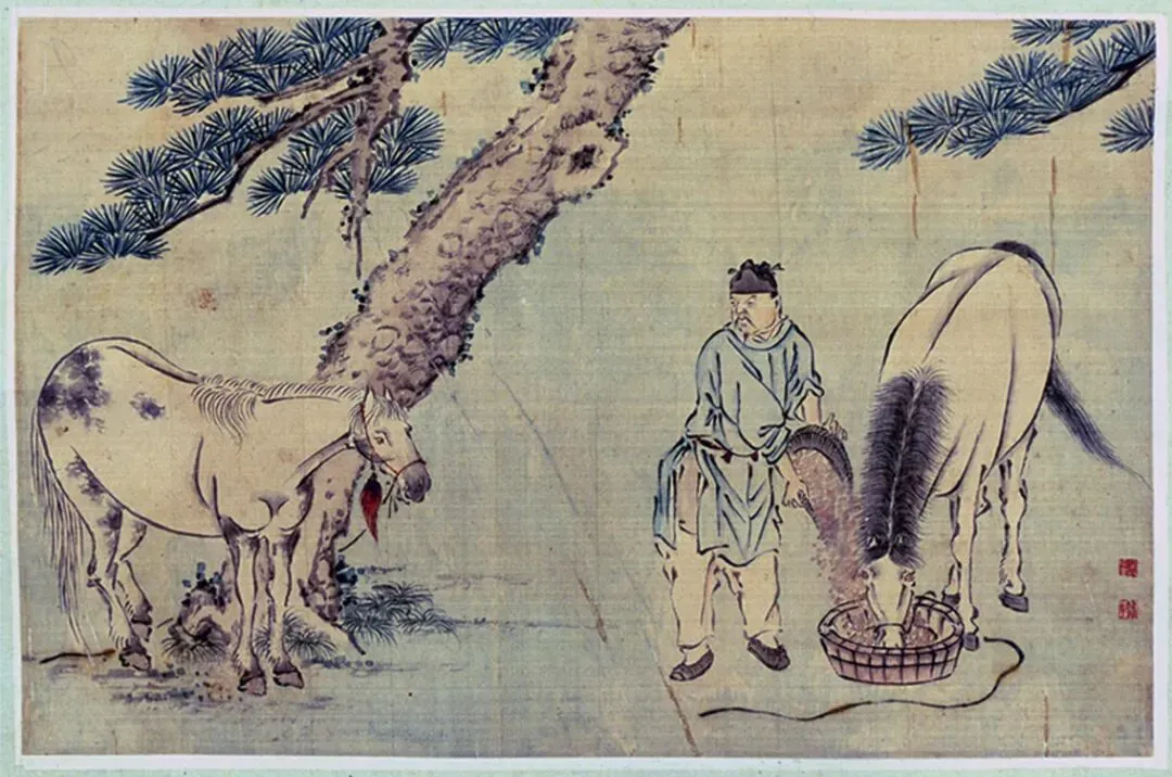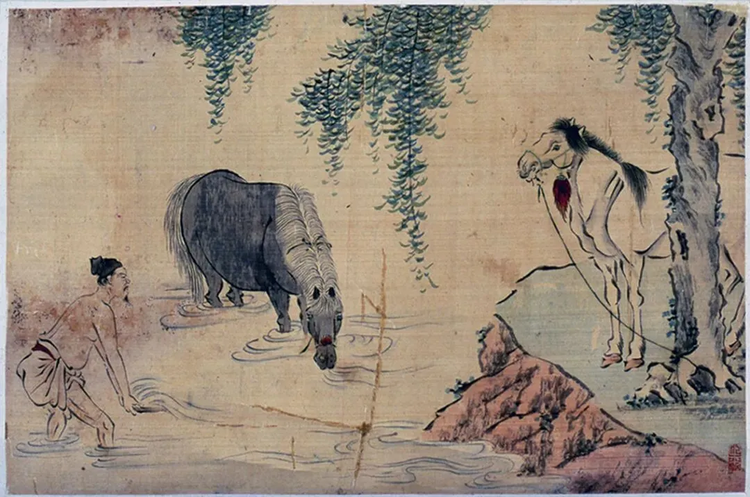 安徽省桐城市博物馆藏清代吴田生所绘绢本设色《牧马图》册页6幅,每幅纵18厘米,横28厘米。册页通过择选、相娱、勒马、争食、沐浴、谐和六个不同环境下13匹良驹的表现,生动刻画了在古代社会中,同人类关系最密切的动物马与人的各种关系。六幅皆工笔画成,造型精准,比例合度,设色古雅,沉着鲜亮而无一丝近俗。每册有印,白文:吴氏田生、心来,朱文:望穞子;其中一页有款:丰溪望穞子写;吴心来,字田生,号望穞子,画家,明末至清康熙安徽歙县人,以擅鞍马、山水、人物闻名于当时。