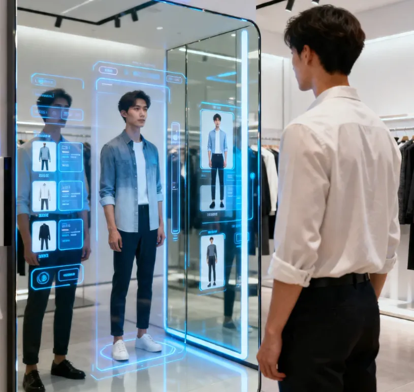 展会上,有个中东采购商用AI试衣镜一连换了好几套衣服。