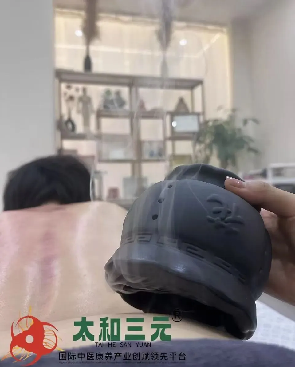 《太和三元热推灸》以“艾灸+刮痧+推拿”三位一体技术,搭配专利帝莲花语能量灸罐、草本精油。